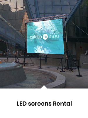 | Rental of giant outdoor screen of 11,6m2 (4,032m x 2,88m) high brightness (6.000 nits) and high definition (6mm pitch) LEDs. Sound system and film reproduction system. |