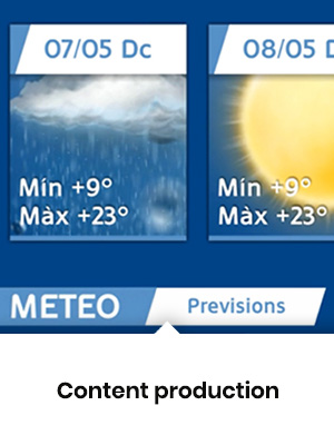 We also create dynamic content with data that is automatically captured and updated, tailored to each sector and industry. Our team of content managers, designers and programmers work together to develop dynamic online content, such as news, agendas, weather forecasts, stock market indices ... which can be viewed on the DOOH channels and Digital Signage screens